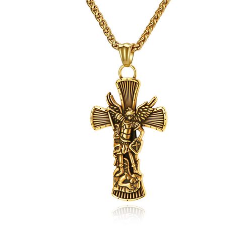 Vintage Distressed Archangel St. Michael Titanium Steel Cross Necklace, Archangel Michael Protective Pendant